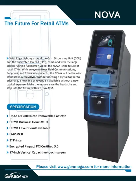 Genmega is proud to announce the new NOVA retail ATM. With a world of new services, new functions, and new revenue generating opportunities, the NOVA stands ready to redefine the retail ATM.